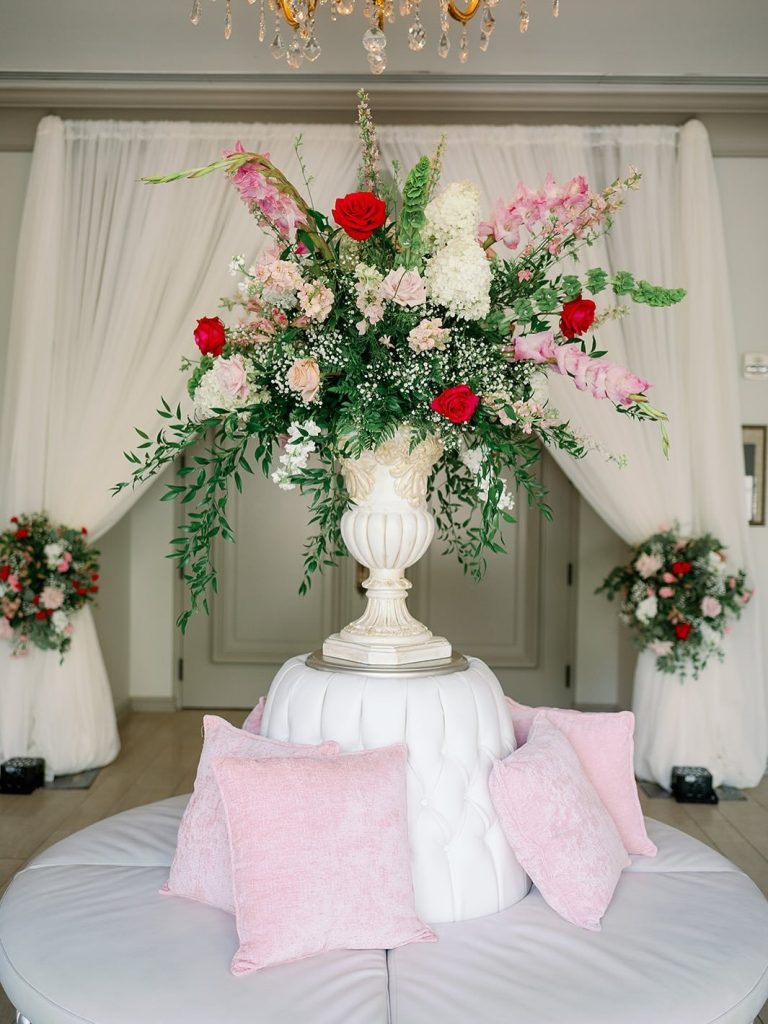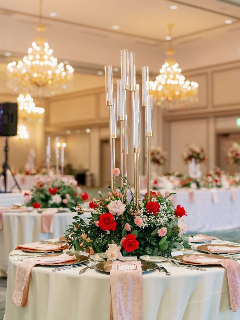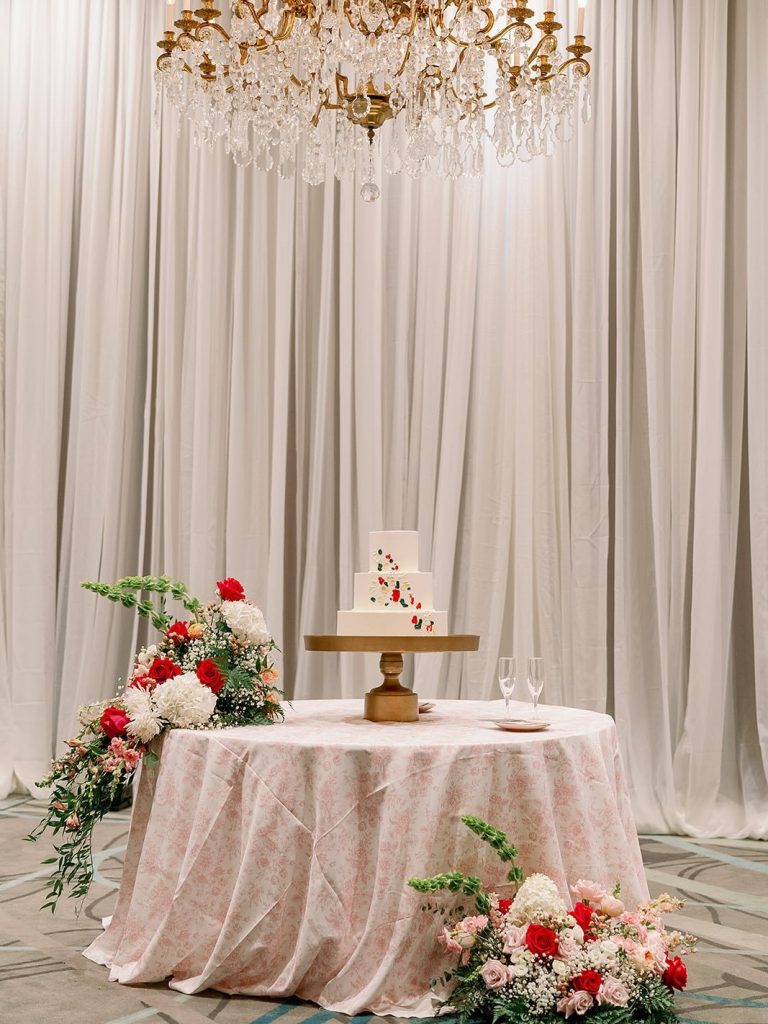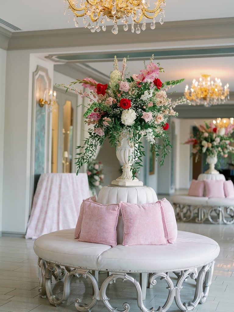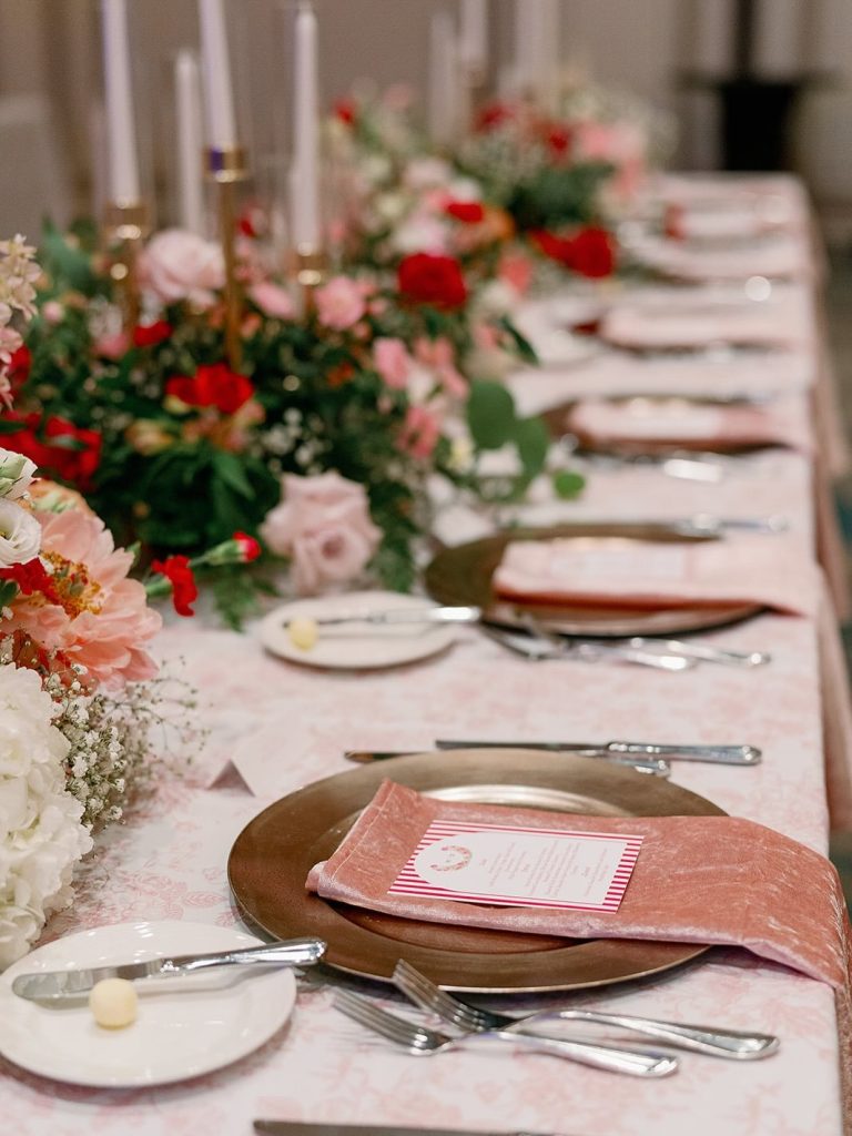 The reception brought the glamour indoors to a stunning ballroom, where the pink palette continued to shine through the décor, florals, and table settings. Every detail felt intentional, from layered arrangements to curated touches that reflected Matti and Dustin’s style. From garden ceremony to ballroom reception, their wedding was a seamless celebration of design, color, and personality — a true pink-on-pink dream come to life.
