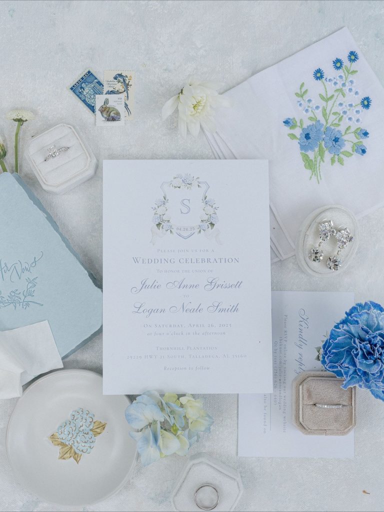 Julie Anne and Logan’s spring wedding was an intimate celebration filled with timeless romance and meaningful family moments. They exchanged vows in a quaint, historic chapel surrounded by their closest loved ones. From Julie Anne’s sister styling her hair to the soft blue and white palette throughout, every detail reflected warmth, love, and classic Southern charm.