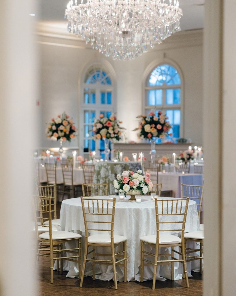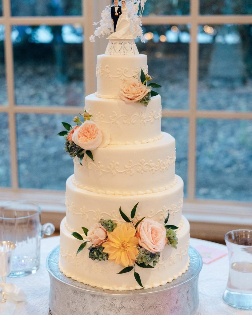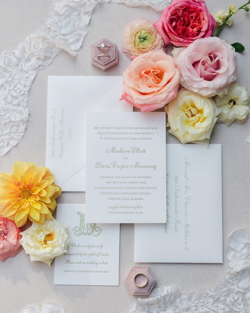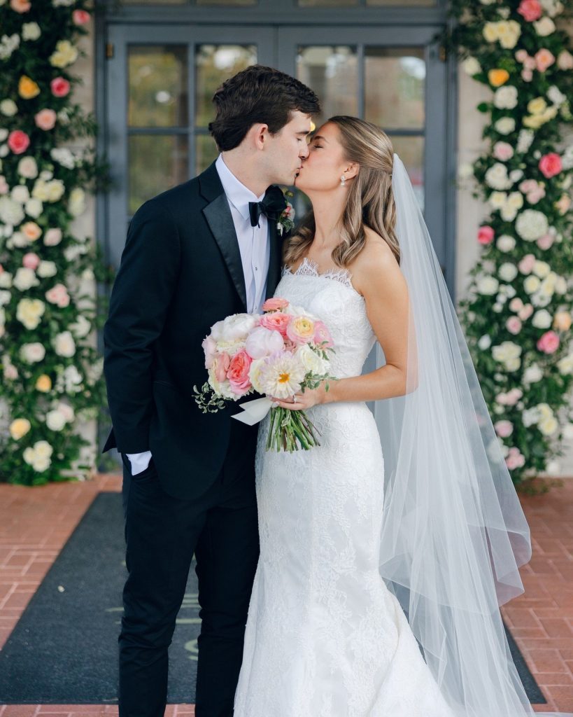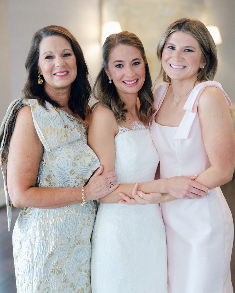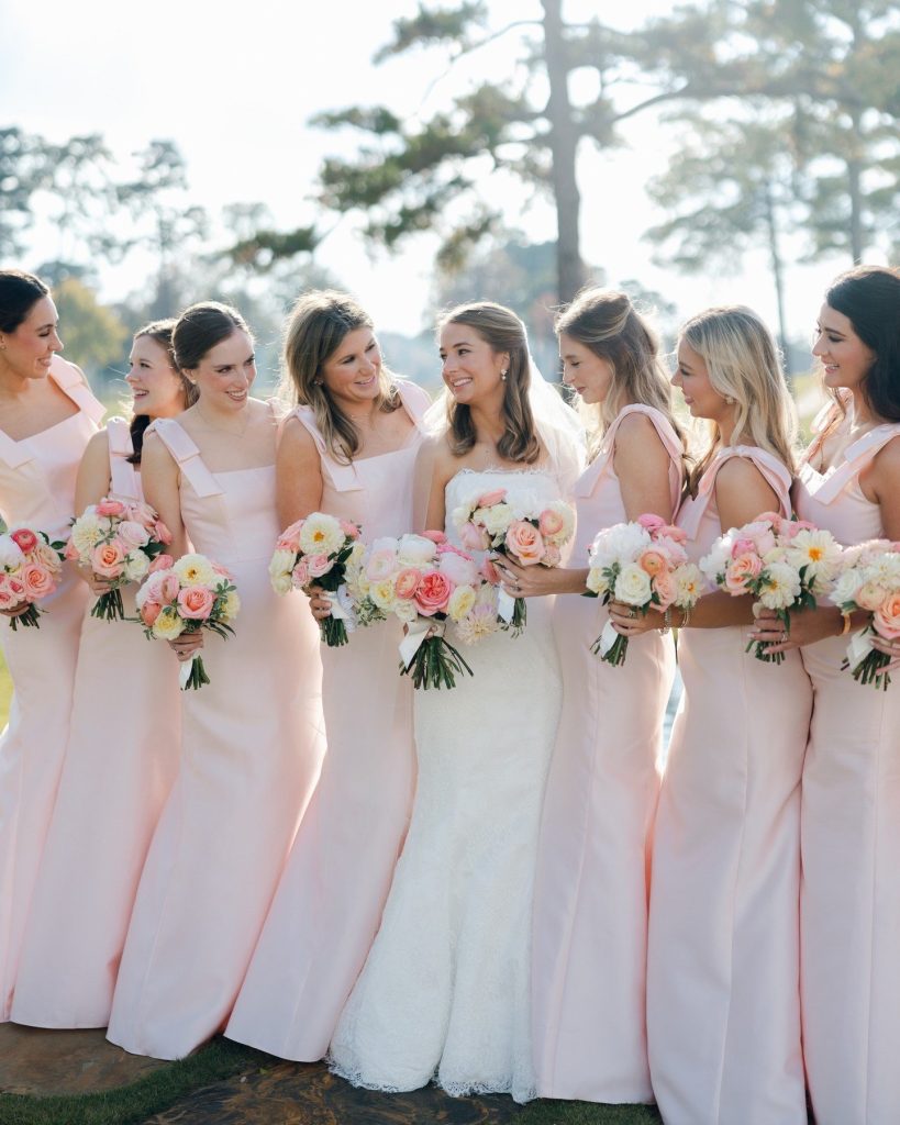 Madison & Davis’s fall wedding featured vibrant florals with pops of pink, orange, and buttery yellow created by Birdsong in Bloom. The bride’s strapless gown with lace details was from Ivory and White Boutique, and the blush bridesmaids’ dresses were sourced from Bella Bridesmaids Birmingham. The 5-tier cake was designed by Pen and Pastry and showcased florals to brighten the classic white design. Floral and classic linens were provided by Decor 2 Adore and provided stunning accents to bistro tables. The entire event was perfectly designed and executed by Threefold Events.