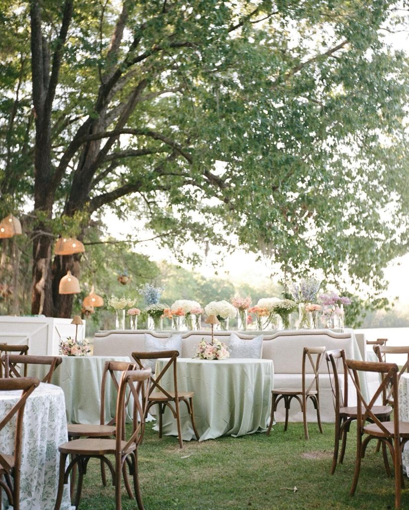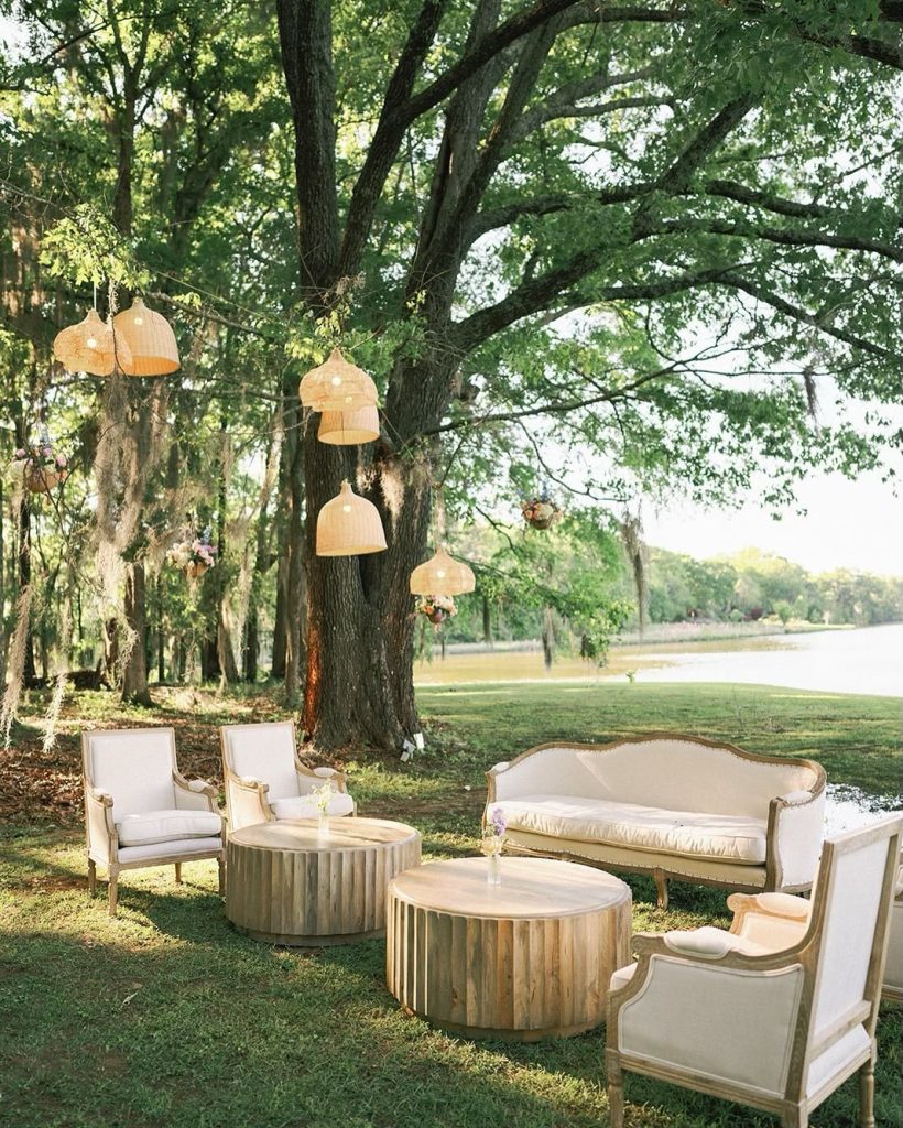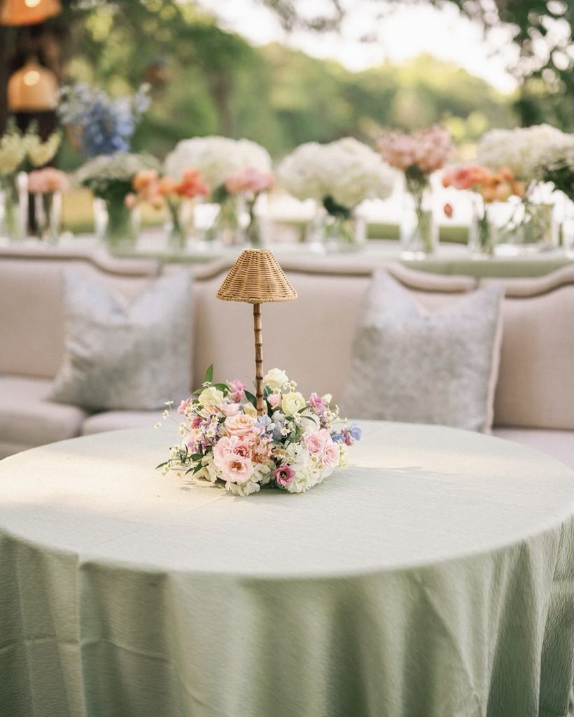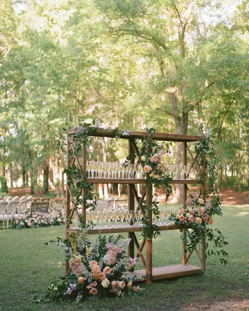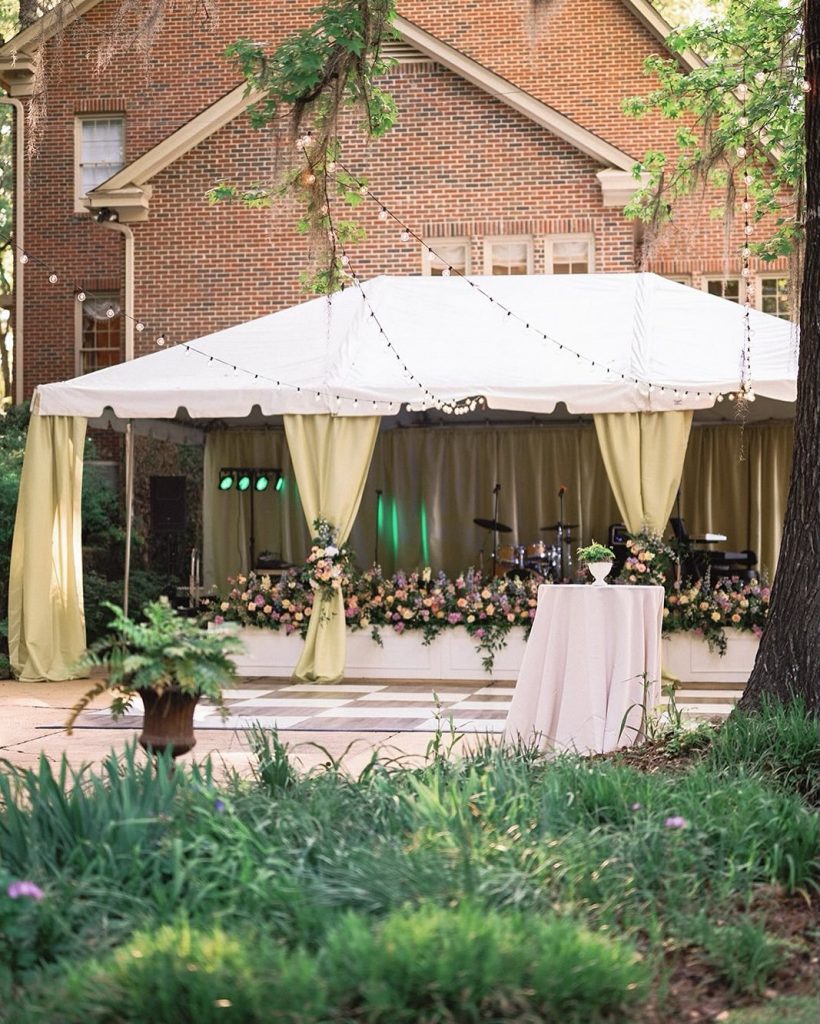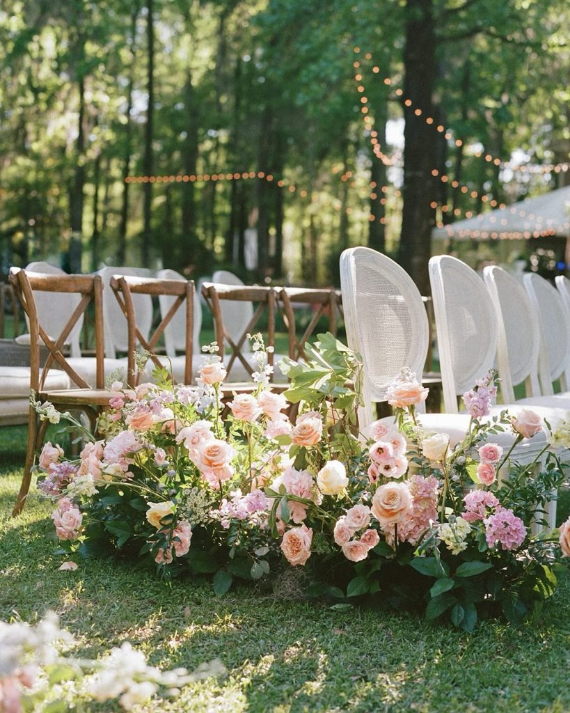 Sarah Sims and Gray’s wedding felt like stepping into a garden bursting with life and color. Wildflowers adorned every corner — from bridesmaids carrying charming flower baskets to florals hanging gracefully from the trees overhead. Their guests sipped on the signature “Azalea” cocktail, a fresh and fruity mix that perfectly matched the vibrant, sun-kissed vibe of the day. Cozy lounge seating and playful dog-themed koozies added personal touches that made this celebration feel warm, joyful, and effortlessly beautiful.