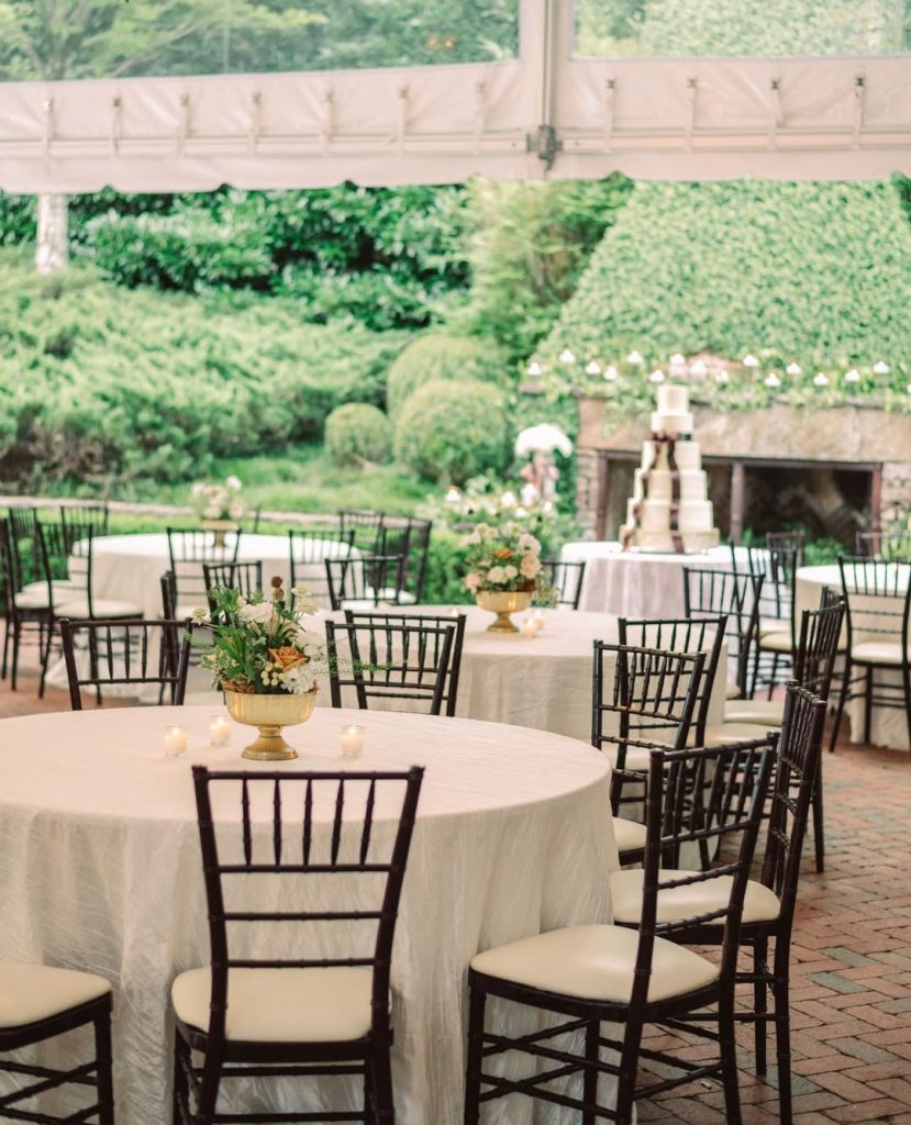 Elegant tent reception with gold chiavari chairs, blue patterned linens, and floral centerpieces under draped white ceiling