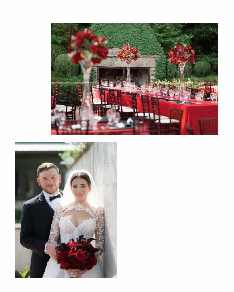 As the celebration moved into the reception, the design came to life in layers—candlelit tablescapes, rich red florals cascading throughout the space, and a classic black-and-white foundation that felt both elevated and enduring. Every arrangement, place setting, and floral installation worked together to create an atmosphere that was bold without feeling overdone.
