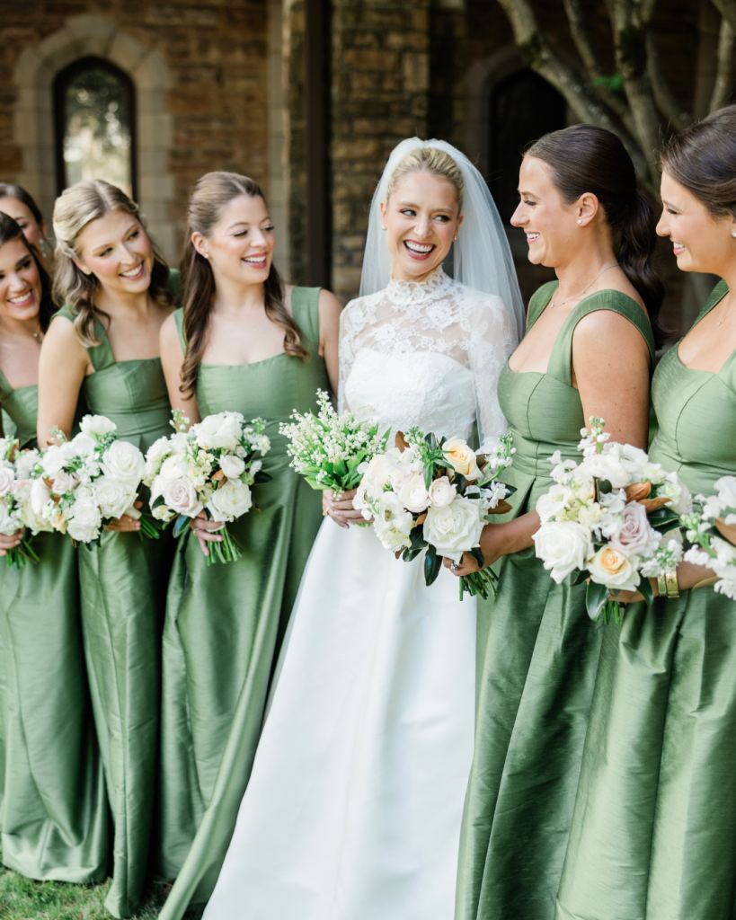 Ceremony highlights? For the bride it was her gorgeous bridesmaids in green gowns from Bella Bridesmaids Birmingham. The bride peeked to watch each one go down the aisle, trying to take in the memory – it was reverent, joyful, and full of love.