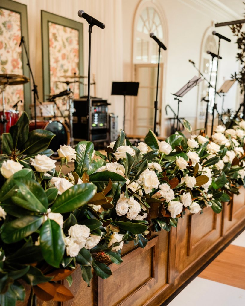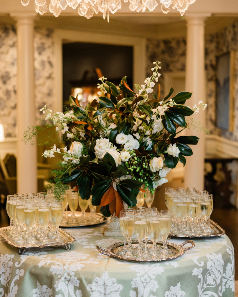 The reception can only be described as cozy, southern, magnolia-obsessed perfection. Decor To Adore helped the bride create a warm and inviting space. With hand sewn pleated tablecloths and carefully curated antique-inspired décor, lush magnolia leaves and white garden roses, and a delicious wedding cake from Pen and Pastry, every detail felt intentional and curated with their guests in mind.
