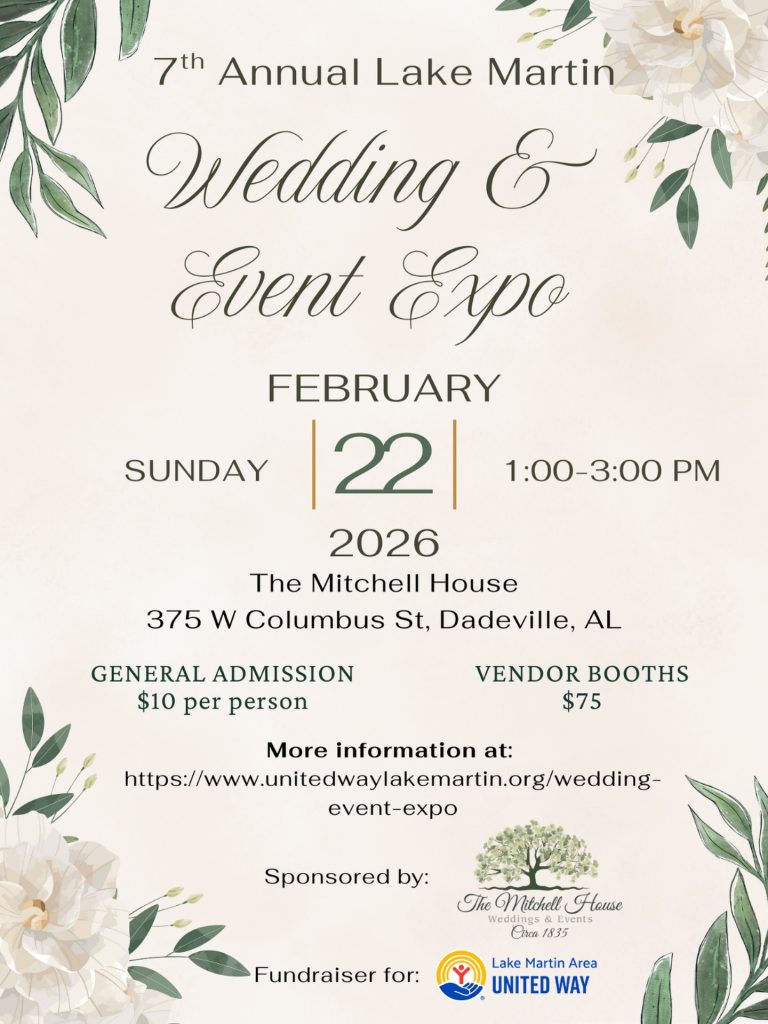 Brides, grooms, & party planners — this one’s for you! 🤍 Join us at The Mitchell House for the 7th Annual Lake Martin Wedding & Event Expo on February 22, 2026. This is a fundraiser for Lake Martin Area United Way! Meet incredible local vendors, get inspired, and start planning your dream day at The Mitchell House. 1–3 PM • $10 admission • ...